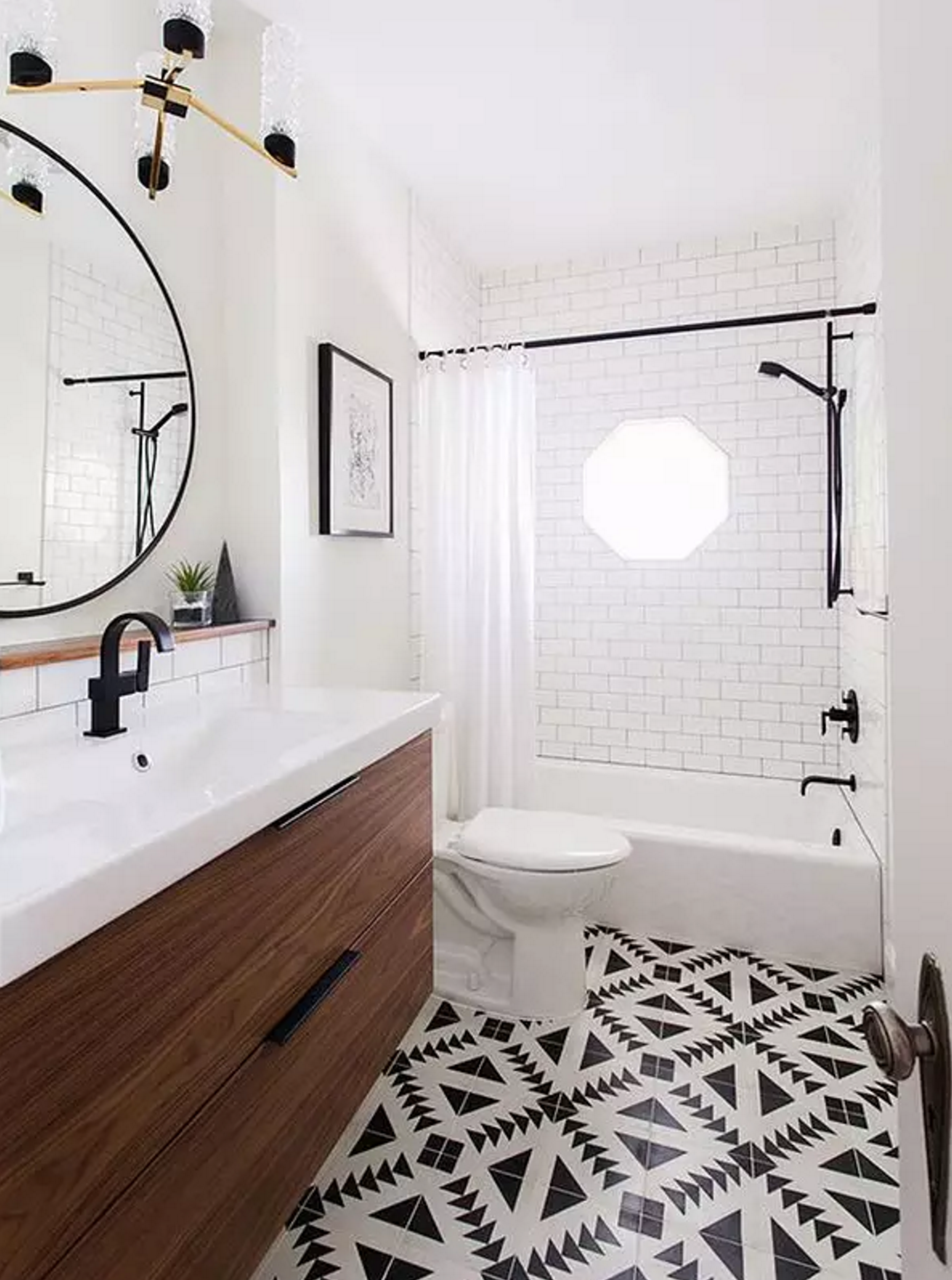 黑与白加黄铜的组合时下正受欢迎,我们可以看到,胡桃木的加入使得整个卫生间的设计变得温暖柔和。