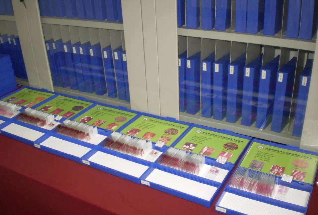 4、 木材切片室——各种永久性木材切片35 000余号,约为1 500种,隶570属,136科以及几百张木材离析纤维样本。