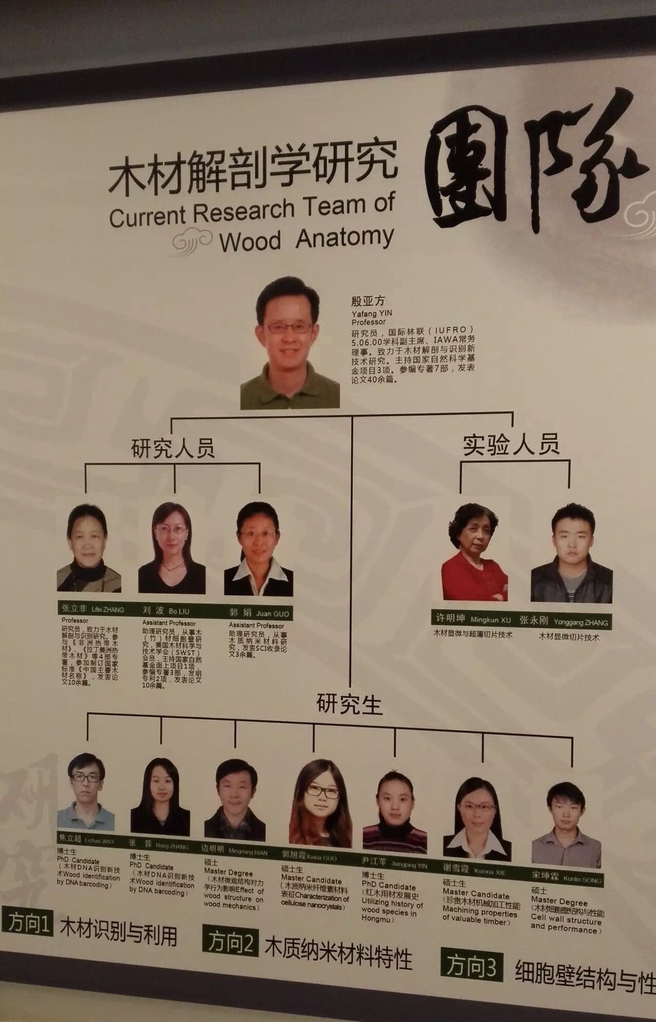 国家树种鉴定与木材检疫重点实验室木材标本馆建有一支业务精湛、富有朝气的专业团队,致力于木材形态学鉴定、跨界新技术的应用研究及检测服务,现有在职人员9人,其中高级农艺师1名,博士1名,研究生4名,拥有中国分会副主任委员在内的IAWA会员4人。