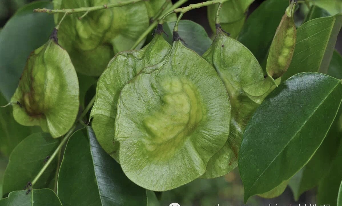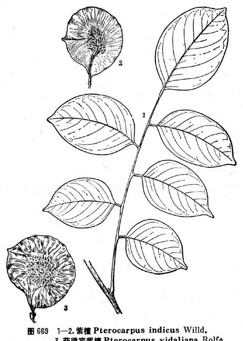上图:印度紫檀(无刺的圆盘形荚果)和菲律宾紫檀(带刺的圆盘形荚果,即刺紫檀)
