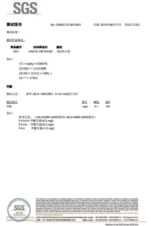 第六,环保安全。泰鲨木地板致力于走环保建材之路,以全球最严谨的环保标准作为产品标准。泰鲨木地板不单止甲醛释放符合日本F4星标准(锯切时绝无刺鼻的甲醛味道);在欧盟化学品管理局REACH163项高度关注物检测结果也是ND(未检出)。泰鲨木地板是市场上极少敢于以日本JIS-A-50908的4星标准明确在订货合同上,并承诺如不达标三倍赔付的木地板企业。